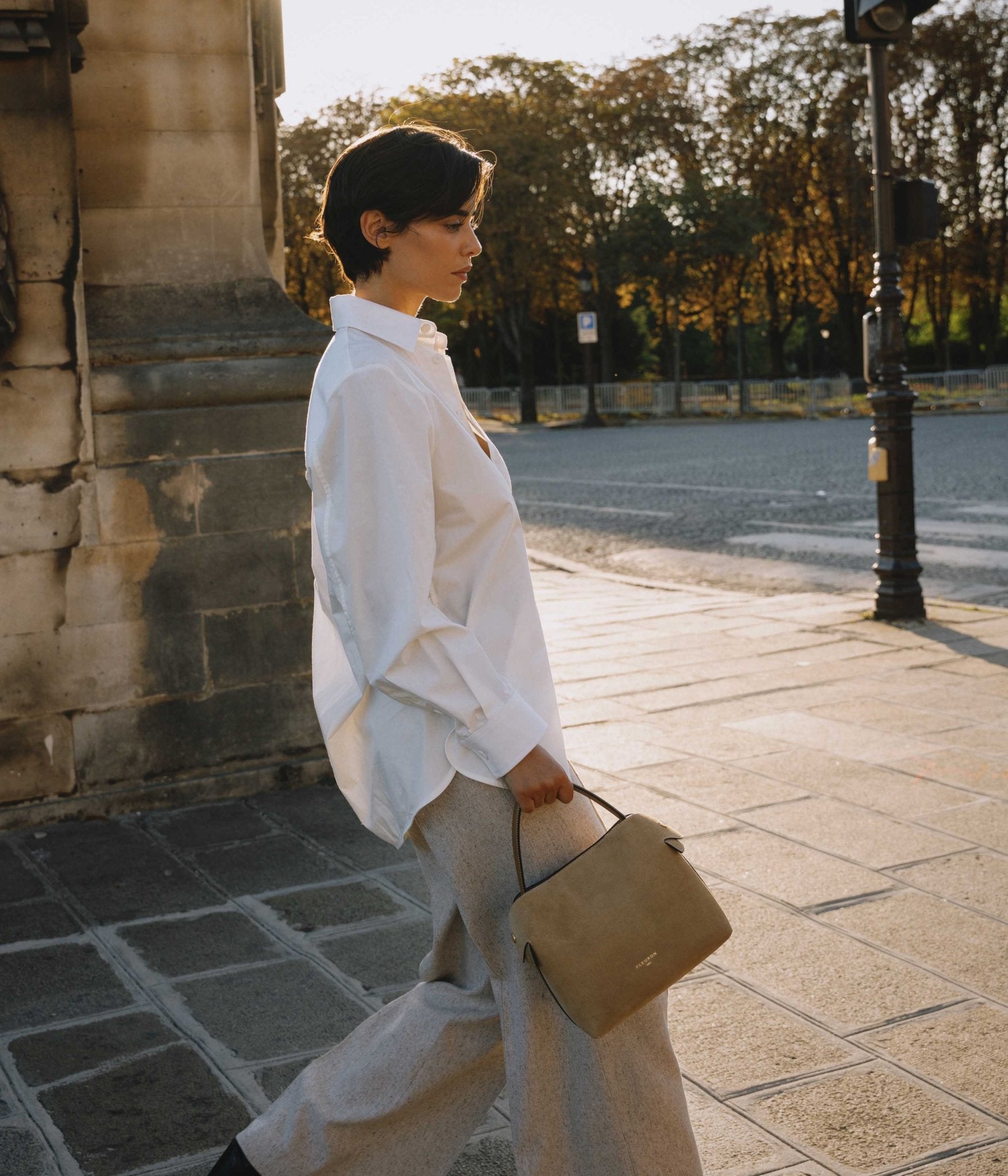 The Medium Swann in Calf Suede Biscuit, designed in Paris and handcrafted in Italy, delights with its softness and natural brightness. Its light, warm Biscuit shade pairs effortlessly with neutral tones like ivory or sand, as well as deeper hues such as navy or chocolate for an elegant contrast.
