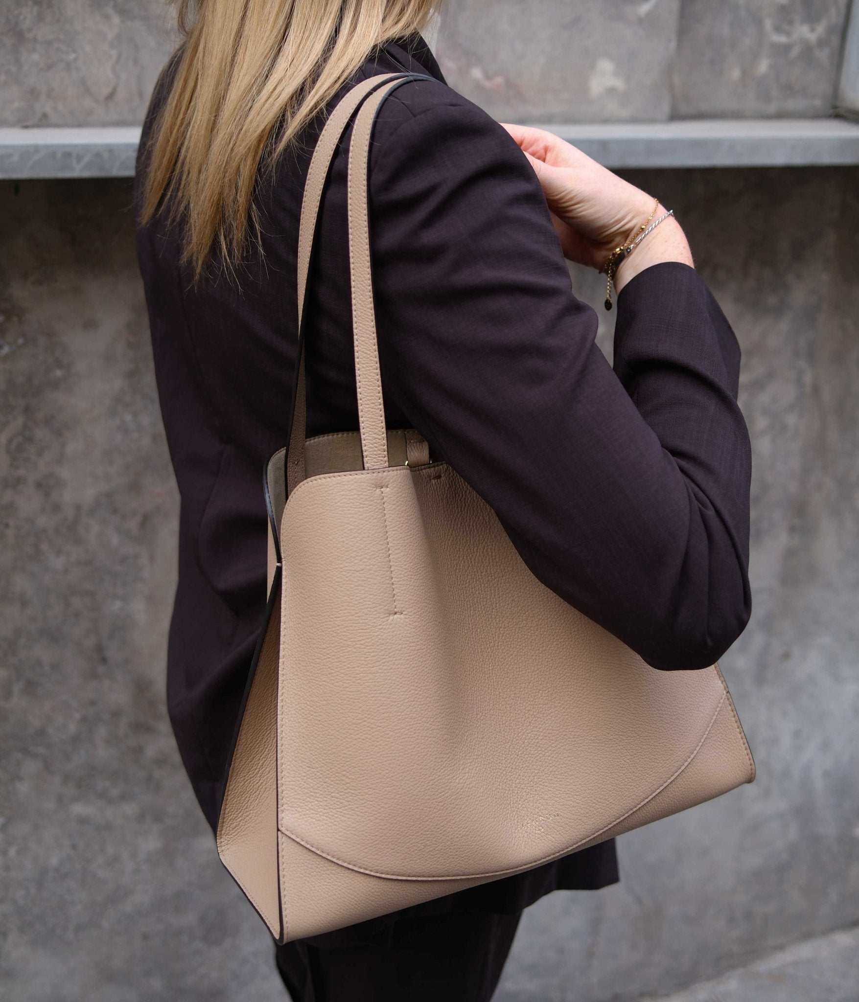 Carefully crafted in our Italian workshops, this grained calfskin tote is elevated by impeccable finishes that reflect exceptional artisanal expertise. Worn over the shoulder, it moves gracefully with you, blending elegance and functionality. Its adjustable interior closure allows you to adapt its shape to your needs, offering the perfect balance of style and practicality. The Medium Oak tote in Sand embodies a modern vision of timeless fashion, combining subtlety and sophistication.