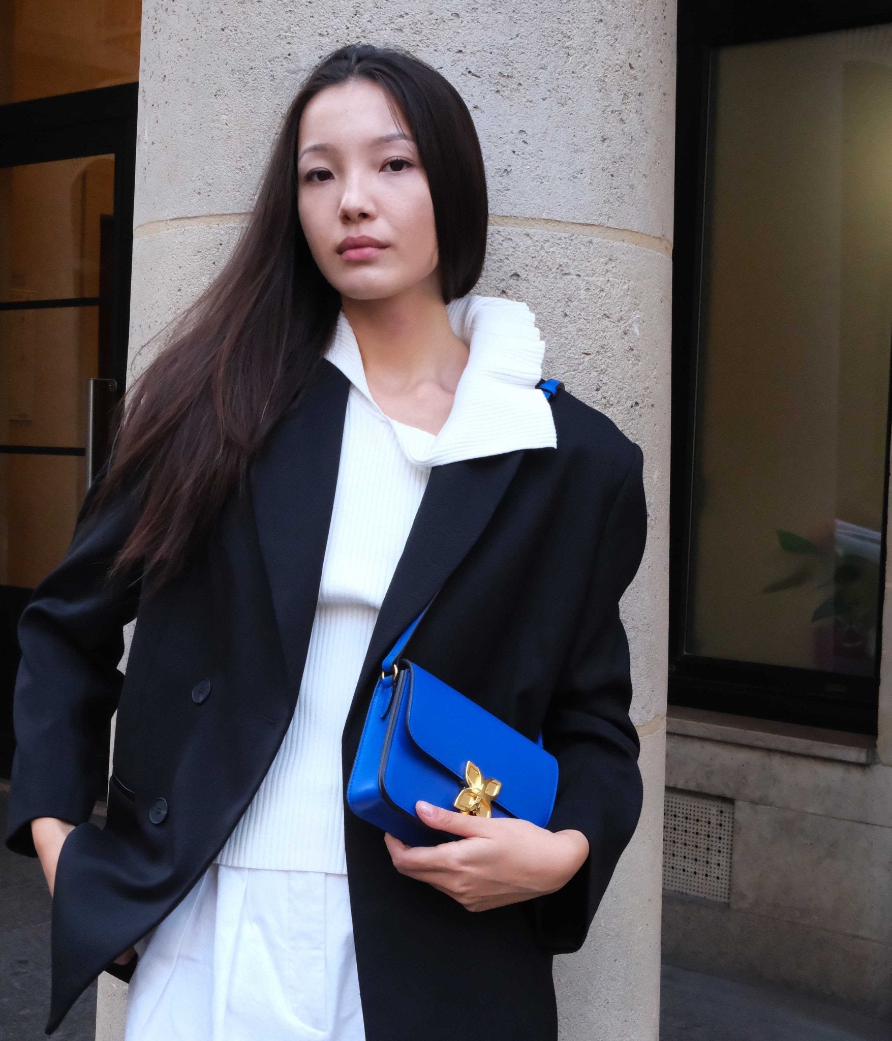 Pair the Mini Hortensia in Bleu Roi with neutral tones like white, ivory, or sand for an elegant contrast that highlights the richness of the color. For a more confident style, it also complements deeper hues such as black, charcoal grey, or burgundy, enhancing the depth of Royal Blue.