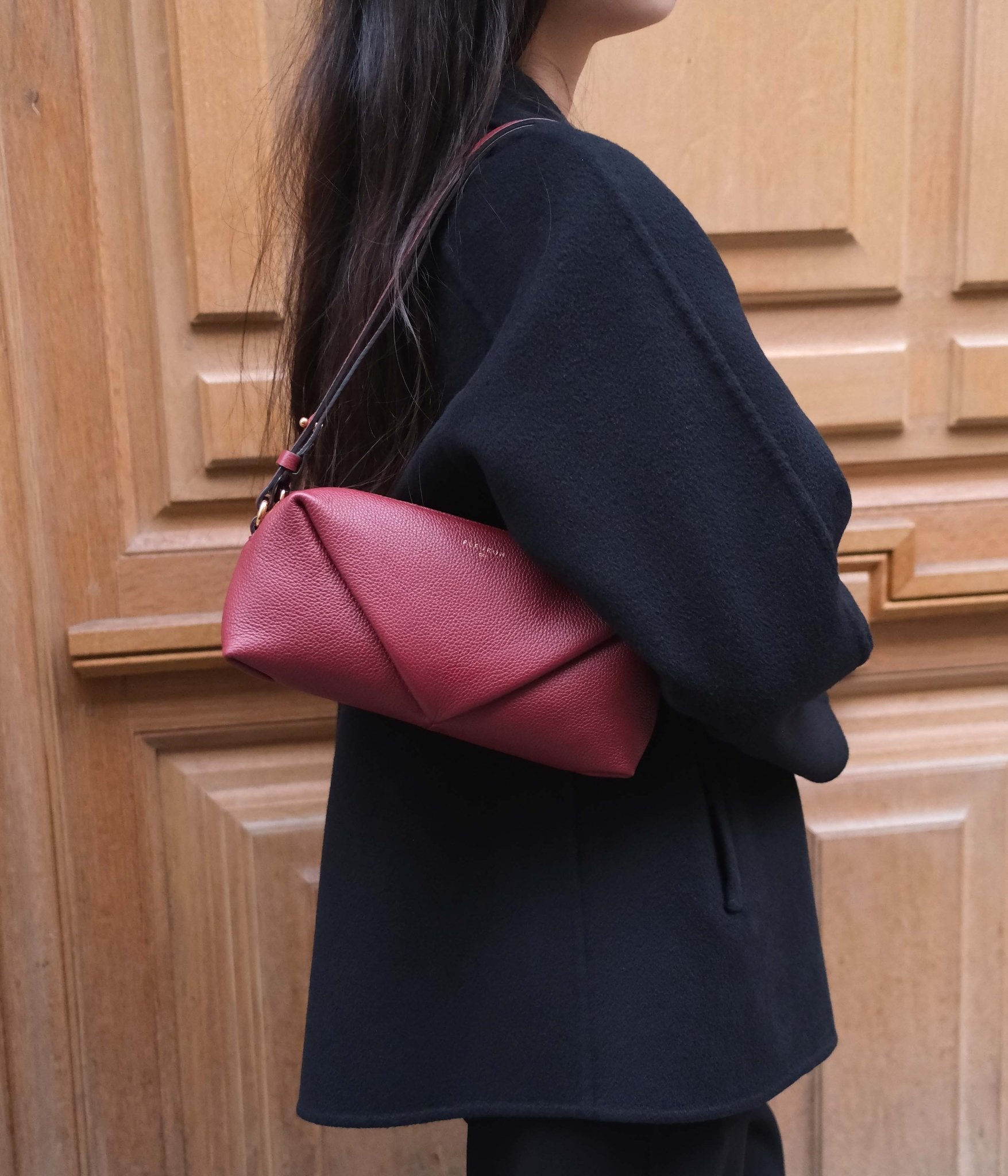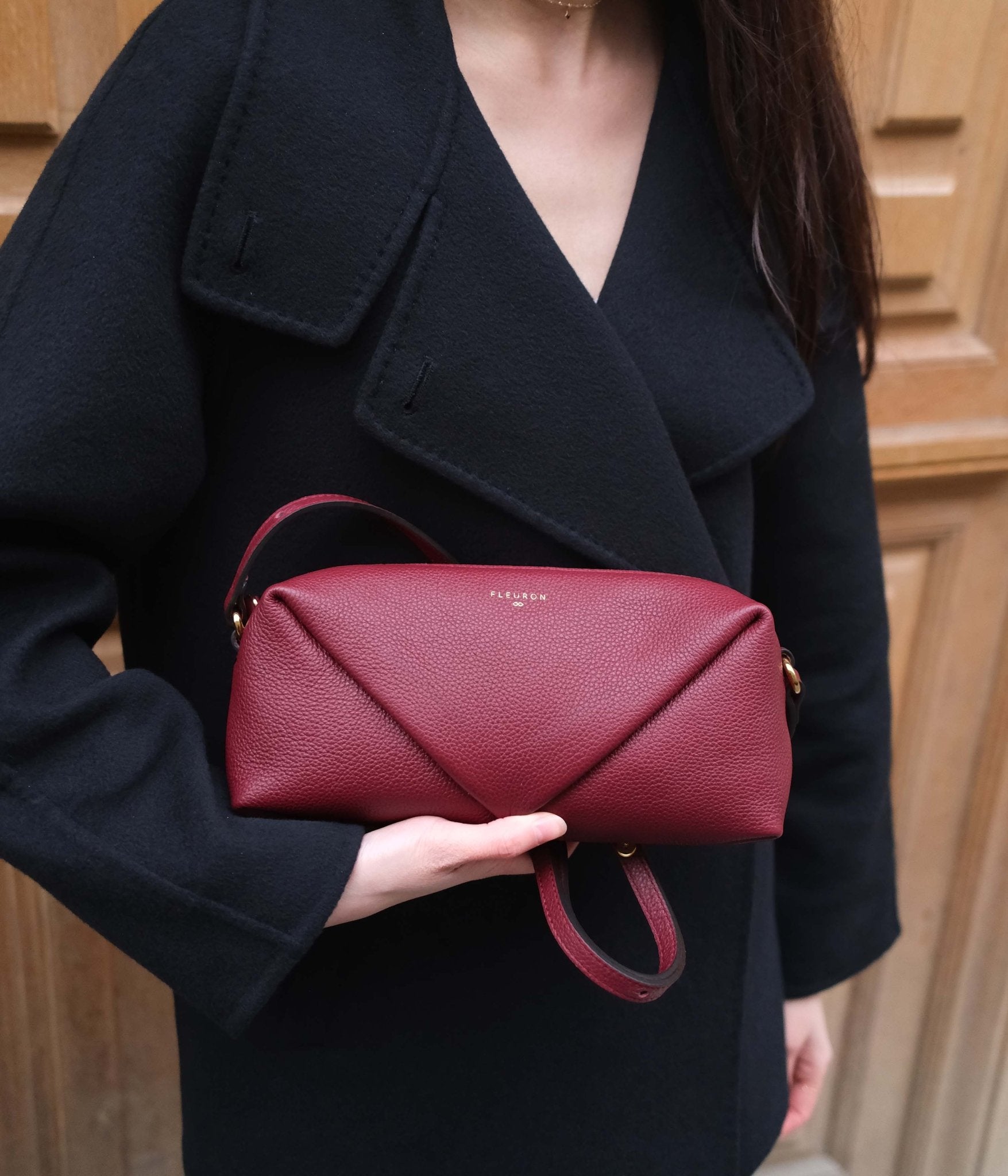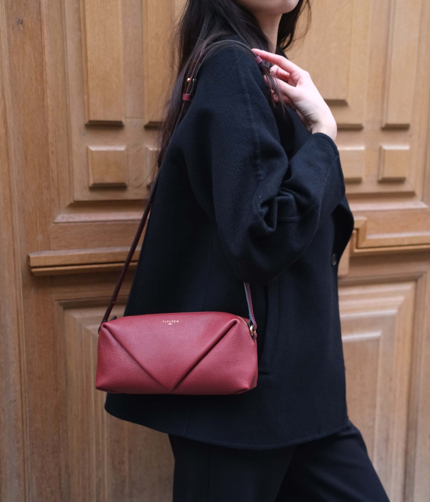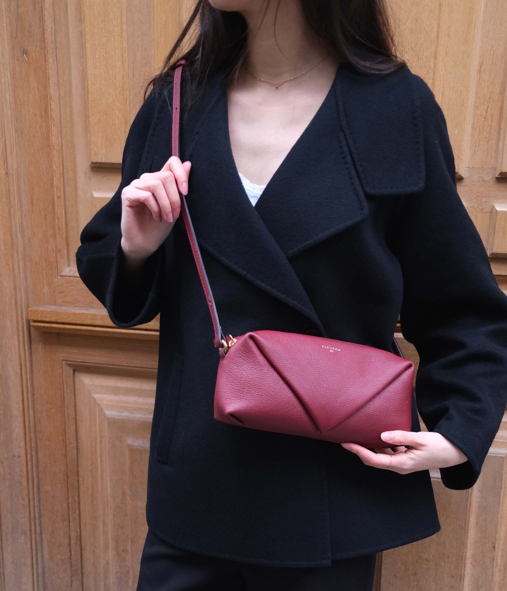 Its adjustable strap allows for multiple styling options: carried as a clutch, worn on the shoulder, or as a short crossbody. The Trinity in Bordeaux pairs beautifully with light tones such as ivory, ecru, or beige for a balanced contrast, and also complements deeper shades like chocolate brown, navy, or black for a confident, contemporary look.