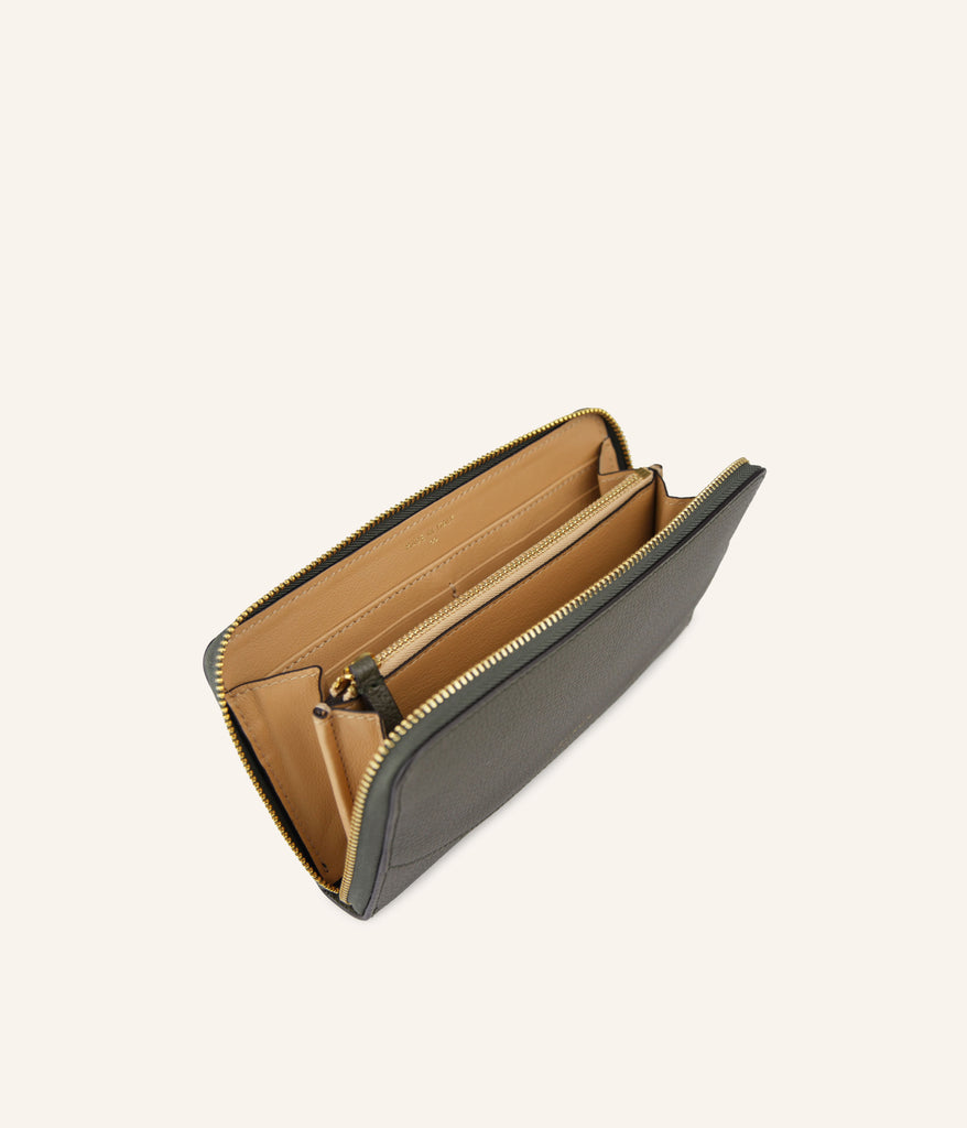Let yourself be inspired by the depth of Vert Olive, a subtle and contemporary shade that brings a touch of character to your everyday essentials. Crafted from grained calf leather, this zipped wallet elegantly combines refinement and practicality. Its carefully arranged interior offers the ideal space for your cards, bills, and coins. Made in Italy, it embodies the perfect balance between sophisticated design and artisanal craftsmanship.